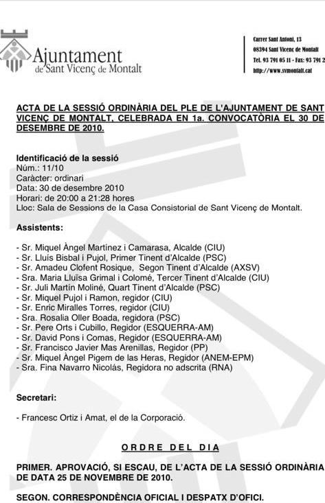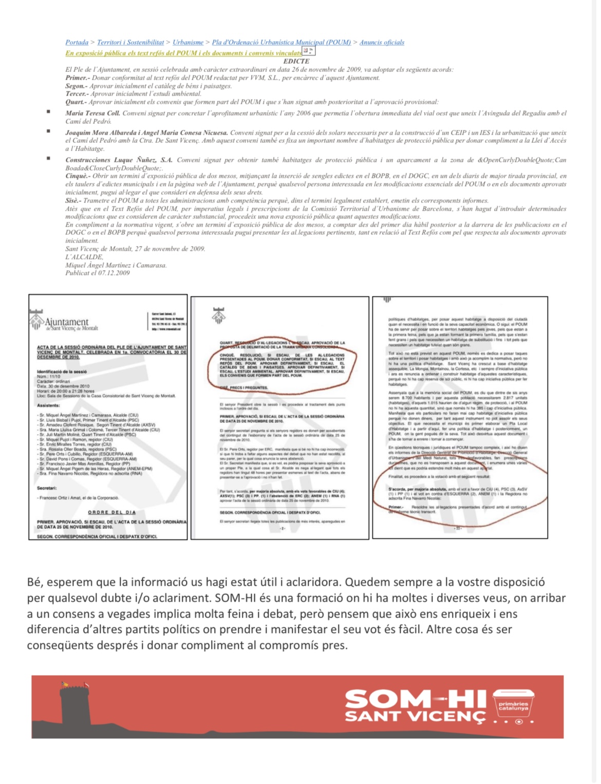 Per últim, voldríem donar la informació complerta perquè la memòria és fràgil però les hemeroteques i les webs existeixen. Quan i qui fa fer l’aprovació del POUM 2011? Com hem dit l’aprovació inicial del POUM anterior va ser el 26 de novembre de 2009. Al dia següent 27 de novembre de 2009 l’alcalde, Miguel Angel Martínez Camarasa, va signar un Edicte per obrir el tràmit d’exposició pública.