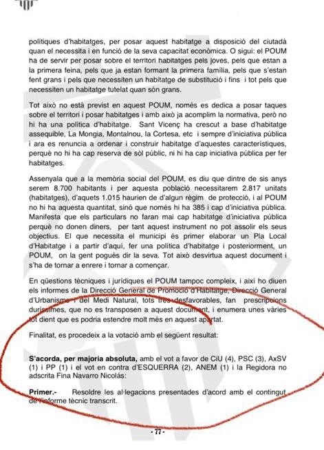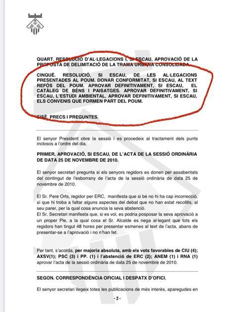 Finalment el 30 de desembre de 2010 es van resoldre les al·legacions presentades i es va aprovar definitivament el POUM, que més tard l’anul·laria la Generalitat de Catalunya.