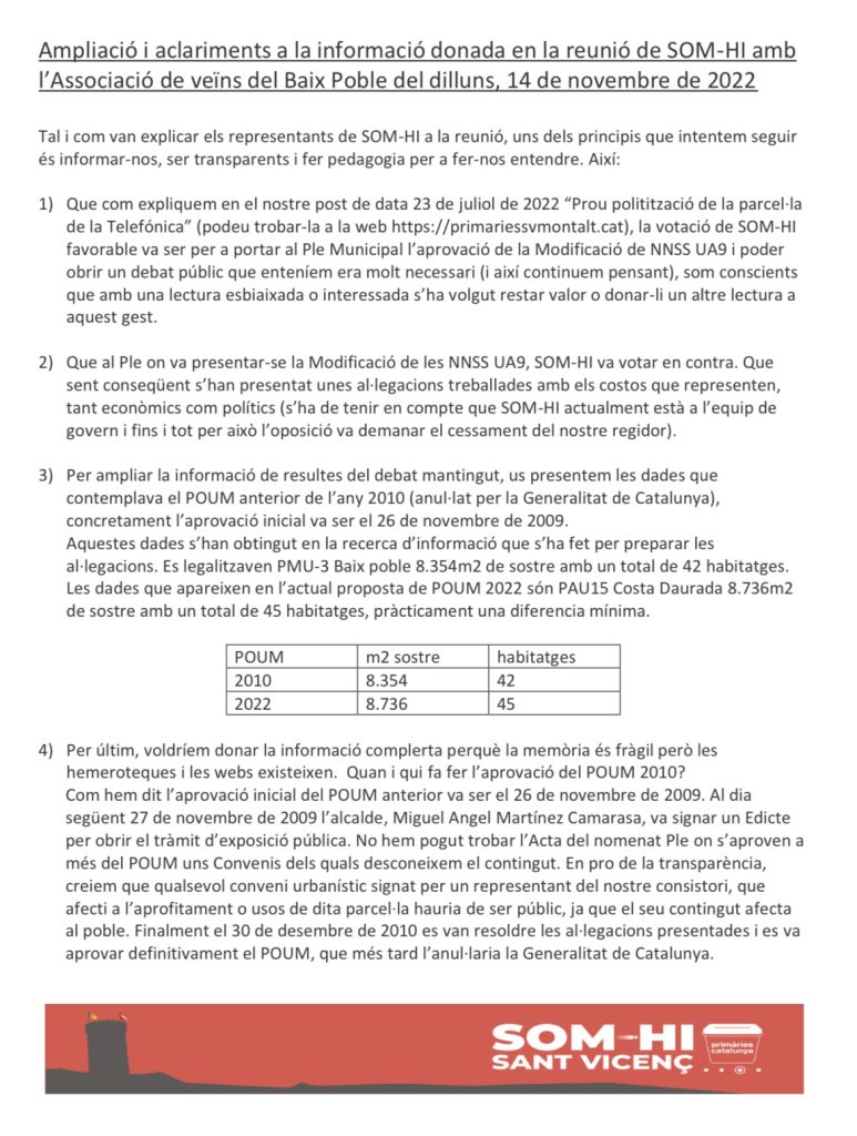 Per a ser conseqüents, el 6 de novembre de 2022 en Sergi Rabat representant a SOM-HI, va presentar unes al·legacions treballades amb els costos que representen, tant econòmics com polítics (s’ha de tenir en compte que SOM-HI actualment està a l’equip de govern i fins i tot per això l’oposició va demanar el cessament del nostre regidor). Esperem que puguin redreçar la situació actual.