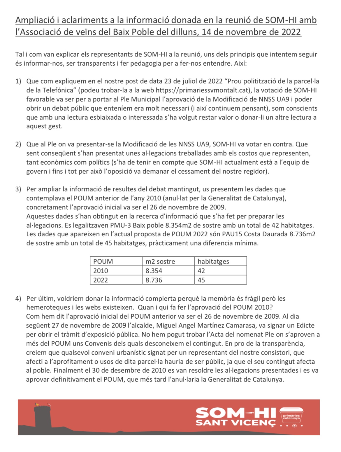 Per a donar a conèixer el posicionament de SOM-HI, el 19 de febrer de 2022 es fa un comunicat que podeu trobar en el següent enllaç: La-parcella-de-la-telefonica